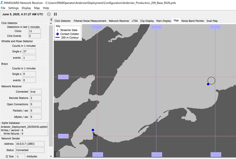 The PAM Operator could be located anywhere with internet access, enabling flexibility in environmental monitoring schemes. A real-time display of a custom-configurable PAMGuard screen allowed them to view click detections, listen to whistle detections, observe noise band levels, and visualize bearing estimations on a map.